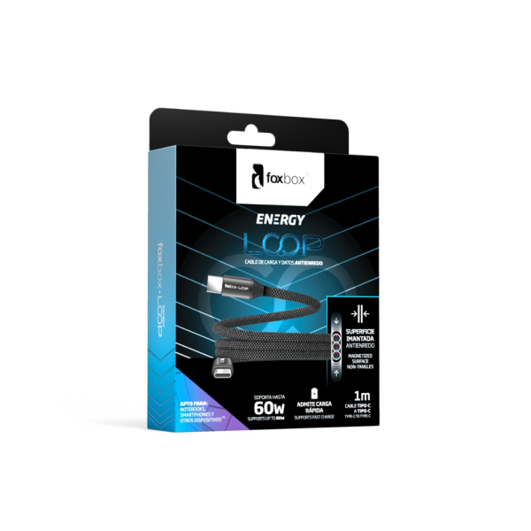 El Cable Magnético Foxbox Loop USB-C a USB-C 60W ofrece carga rápida segura y transferencia de datos estable en notebooks, tablets y smartphones. Su conector magnético de acople rápido protege el puerto de desgaste y facilita la conexión diaria. Con diseño reforzado en color negro, es el accesorio ideal para quienes buscan durabilidad, potencia y practicidad en Córdoba y toda Argentina.